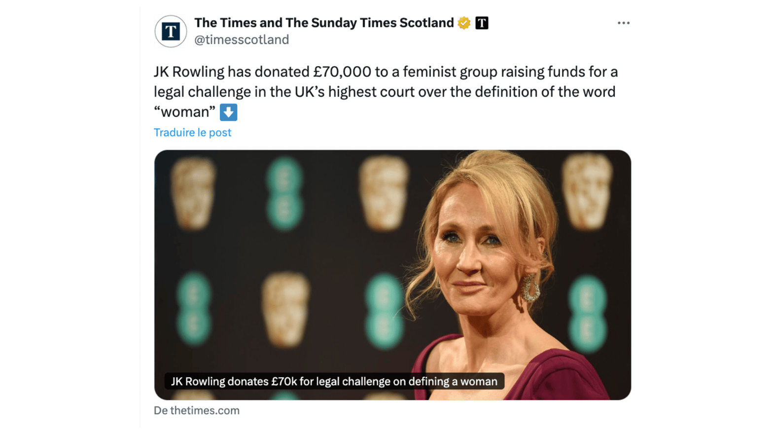 En février 2024, J.K. Rowling verse 70 000 £ à For Women Scotland, un groupe militant anti-trans qui refuse que les femmes trans soient reconnues comme femmes dans le droit. L’argent sert à relancer une procédure devant la Cour suprême. L’objectif est simple : obtenir que les femmes trans, même légalement reconnues, soient exclues de la définition du mot “femme” dans la loi.